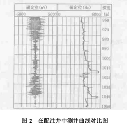 圖2是在中40-PXX配注井中的測井曲線。測試條件是儀器在油管和配注工具內居中測井。左側是原磁性定位曲線,測井速度90m/h,曲線干擾嚴重,無法辨別出接箍和工具的設置情況。右側是更換后的接箍曲線,測井速度1200m/h,在 997m以上是油管段,各接箍位置清楚,在997m以下是工具段,各工具顯示清楚。在1006m~1007m和1032m~1034m兩處是Φ114mm封堵器;在1016m~1018m和1043m~1045m兩處分別是Φ54mm和Φ56mm的配水器短接,因其內徑小而幅度高;1018m~1023m是5個配接短接。