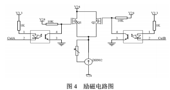 勵磁電路決定儀表的工作磁場,是儀表極其關鍵的部分。本文中的勵磁電路由兩部分組成,如圖4所示。由單片機MSP430F2418的定時器產生雙頻矩形波,經光耦隔離后通過兩片場效應管組成的開關電路實現通斷功能。DH902為恒流管,提供恒定的勵磁電流,由MCU定時器脈沖寬度調制(PWM)輸出經過濾波后控制勵磁電流的幅值,從而產生雙頻矩形波。