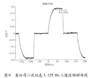 *先,采用某公司生產(chǎn)的二次儀表匹配一次儀表進行勵磁。該二次儀表采用在H橋低端設置恒流晶體管進行恒流控制的方法,其勵磁曲線結果如圖6所示,勵磁頻率為3.125Hz,勵磁方式為三值波勵磁,勵磁電流大約在51.16ms左右進入穩(wěn)態(tài),勵磁電流穩(wěn)態(tài)段波動較大。