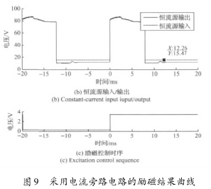 實驗結果表明,高壓源向低壓源切換后,三端穩(wěn)壓器的工作特性致使的電流波動和低壓源供電情況下的恒流控制,會大幅延長勵磁電流的穩(wěn)態(tài)響應時間。圖8所示勵磁電流約在17ms左右進入穩(wěn)態(tài),圖9所示勵磁電流的穩(wěn)態(tài)響應時間約為12ms。這表明,在采用三端穩(wěn)壓器搭建恒流控制電路的情況下,電流旁路電路能有效克服三端穩(wěn)壓器工作特性的影響,并能方便的實現(xiàn)電流超調(diào),加快勵磁電流的響應速度。
