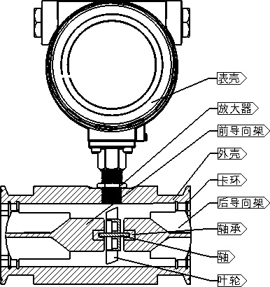 圖所示為渦輪流量傳感器結構簡圖,由圖可見,當被測流體流過傳感器時,在流體作用下,葉輪受力旋轉,其轉速與管道平均流速成正比,葉輪的轉動周期地改變磁電轉換器的磁阻值。檢測線圈中的磁通隨之發生周期性變化,產生周期性的感應電勢,即電脈沖信號,經放大器放大后,送至顯示儀表顯示。