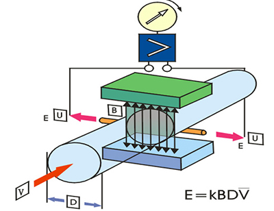 電磁流量計的工作原理是基于法拉*電磁感應(yīng)定律。在測量管內(nèi)的導(dǎo)電介質(zhì)相當于法拉*試驗中的導(dǎo)電金屬桿,上下兩端的兩個電磁線圈產(chǎn)生恒定磁場。當有導(dǎo)電介質(zhì)流過時,則會產(chǎn)生感應(yīng)電壓。管道內(nèi)部的兩個電極測量產(chǎn)生的感應(yīng)電壓。