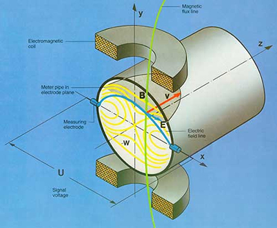 電磁流量計的工作原理是基于法拉*電磁感應定律。在測量管內的導電介質相當于法拉*試驗中的導電金屬桿,上下兩端的兩個電磁線圈產生恒定磁場。當有導電介質流過時,則會產生感應電壓。管道內部的兩個電極測量產生的感應電壓。