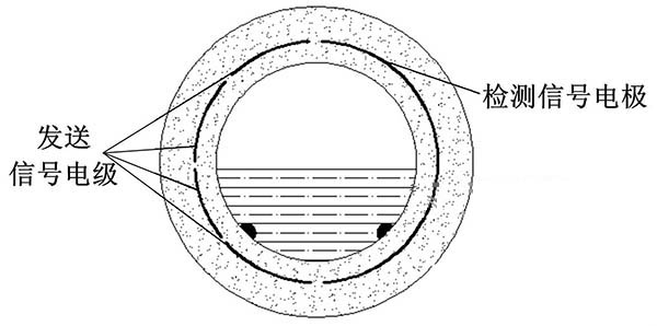 ③利用阻抗或信號衰減研制的非滿管一寸管污水流量計。這種結(jié)構(gòu)的非滿管一寸管污水流量計是當(dāng)前國內(nèi)研究的方向之一。其結(jié)構(gòu)是流量管底部貼一對信號發(fā)射電極,在流量管中間貼信號接收電極。由于信號在流體中傳播會產(chǎn)生衰減,且傳播時間越長,衰減越多,因此通過信號接收電極接收到的信號衰減量即可得知液面高度;同時該電極還能測量流體切割磁感線產(chǎn)生的電動勢,以此達(dá)到測量非滿管流量的目的。阻抗式或信號衰減非滿管一寸管污水流量計結(jié)構(gòu)簡圖如圖5所示。
