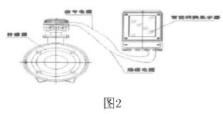 測(cè)氨水流量計(jì)是由流量傳感器和轉(zhuǎn)換器(也叫顯示器)兩大部分組成。測(cè)量管上下裝有激磁線圈,通激磁電流后產(chǎn)生磁場(chǎng)穿過測(cè)量管,一對(duì)電極裝在測(cè)量管內(nèi)壁與液體相接觸,引出感應(yīng)電勢(shì),送到轉(zhuǎn)換器。激磁電流則由轉(zhuǎn)換器提供。如圖2所示: