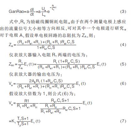 測量電極與流體介質接觸時會發生電化學反應在電極-溶液界面形成阻抗,通常由法拉*阻抗與雙電層電容并聯組成。 法拉*過程分為電荷傳遞過程和擴散過程,相應的法拉*阻抗由電荷傳遞電阻與擴散阻抗串聯組成。一般冷卻水流量計的勵磁頻率大于1Hz,而擴散阻抗發生在更低頻率內,不考慮擴散過程,電極等效阻抗為電荷傳遞電阻與雙電層電容并聯后再與電極接觸電阻串聯。 基于電極阻抗建立的電極等效測量回路如圖 1 所示。圖中:Rs1 和 Rs2 為電荷傳遞電阻;C1 和 C2 為雙電層電容;Rt為兩個測量電極間的接觸電阻滿足 Rt=Rt1+Rt2;Lx 為勵磁線圈等效電感;L1 為閉合回路等效電感;R1 和 R2 為放大器輸入電阻;P1和 P2 為由“變壓器效應”疊加在測量電極上的微分干擾;U1 為流體切割磁力線產生的感應電勢;Ue 為勵磁電壓。 假設磁感應強度由勵磁電流決定且成正比關系即 B=aI,忽略串模等干擾則電極間電壓為感應電勢與微分干擾的疊加,基本方程如下: