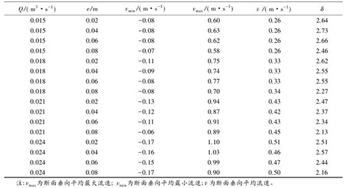 流速沿斷面分布的均勻特性可以通過流速分布不均勻系數進行表征,通過所選取斷面*大流速和*小流速的差值與該斷面平均流速的比值,δ值越大表明浮體結構的存在對水流斷面流速的分布產生的影響較大。表2中,當來流流量相同時,流速的不均勻系數多數隨e的增大而減小。浮體結構位置較小時,主流為浮體結構上部的水流。隨著浮體結構位置的上升,來自上游的水體逐漸分成浮體結構上部和下部的兩股主流,流速分布的不均性減小。浮體結構位置及所處水位條件相同時,來流流量的增大,區域的平均流速增大,因此流速不均勻性減小。