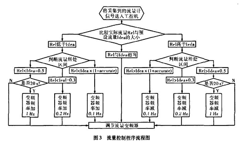 實際生產(chǎn)中流量一直在某個區(qū)域內(nèi)波動,且其動態(tài)特性不易掌握。從上面的理論中我們能夠讓誤差△£盡可能的小,這樣距我們所需要的理論值%就越接近。而減小誤差需要我們把n取的盡可能大,也就是在生產(chǎn)時間內(nèi)劃分更多的周期去調(diào)節(jié)流量。當工控機根據(jù)一體化污水流量計傳送回來的信號發(fā)出調(diào)節(jié)變頻器工作頻率的指令后,電機調(diào)整功率到一體化污水流量計的實際測量為一個工作周期,我們知道從指令發(fā)送到實際測量值返回有一個較大的滯后,如果調(diào)節(jié)的周期時間小于流量計本身的一個工作周期,那么顯然不可能達到減小誤差的目的。利用模糊控制思想H。,在控制程序中我們把流量的波動區(qū)域劃分為±缸×Yo,Yo-t-O.3,Yo±0.5四個區(qū)域,其中缸為可調(diào)節(jié)的誤差范圍,生產(chǎn)中我們?nèi)?.015,流量區(qū)域劃分的單位均為t/h。針對不同的區(qū)域采取不同的調(diào)整方案。具體流程如圖3所示。圖中變量Rel表示實際測量的流量,變量Idea表示理論流量。
