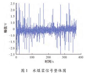 針對(duì)污泥計(jì)量表測(cè)量水煤漿時(shí)出現(xiàn)較大波動(dòng),甚至回零這一問題,特去某煤化工企業(yè)甲醇分公司進(jìn)行現(xiàn)場(chǎng)數(shù)據(jù)采集。該公司所使用的對(duì)置式四噴嘴氣化有4個(gè)噴嘴,噴嘴管道口徑為125mm,管中水煤漿流量基本穩(wěn)定在19m³/h(流速約為0.48m/s)。每條噴嘴煤漿線上安裝了3臺(tái)污泥計(jì)量表,每臺(tái)污泥計(jì)量表由傳感器和變送器兩部分組成。選擇其中1條水煤漿管線上的1臺(tái)污泥計(jì)量表進(jìn)行數(shù)據(jù)采集,因?yàn)樵撆_(tái)污泥計(jì)量表測(cè)量結(jié)果波動(dòng)大,甚至出現(xiàn)回零的現(xiàn)象。將課題組研制的基于DSP的電磁流量變送器的信號(hào)線和勵(lì)磁線接到該電磁流量傳感器的電極和勵(lì)磁線圈上,組合成完整的污泥計(jì)量表,進(jìn)行水煤漿數(shù)據(jù)采集。使用的電磁流量變送器是以TI公司DSP芯片TMS320F28335為核心,采用高頻勵(lì)磁方案,其硬件主要包括勵(lì)磁控制系統(tǒng)和信號(hào)采集處理系統(tǒng),具體的模塊有勵(lì)磁驅(qū)動(dòng)模塊、信號(hào)調(diào)理采集模塊、信號(hào)處理控制模塊、人機(jī)接口模塊、通信模塊及電源管理模塊。信號(hào)調(diào)理采集模塊中的調(diào)理電路對(duì)一次儀表輸出的信號(hào)進(jìn)行放大和濾波,截止頻率是2kHz,放大倍數(shù)約為230倍。通過NI公司USB-6216型號(hào)的數(shù)據(jù)采集卡進(jìn)行數(shù)據(jù)采集,把調(diào)理電路的輸出端連接到數(shù)據(jù)采集卡的一個(gè)差分輸入端,并設(shè)置數(shù)據(jù)采集卡工作在差分的測(cè)量模式,設(shè)置采集卡的采樣頻率為10kHz。采集多組水煤漿信號(hào)數(shù)據(jù),每組數(shù)據(jù)的時(shí)間長(zhǎng)度為5min。