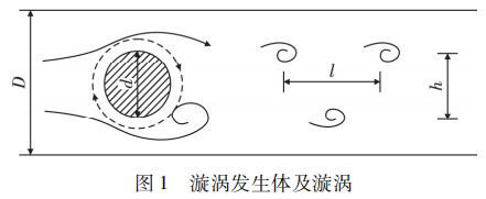 氮氣流量計是由漩渦發生體、頻率檢測器和信號轉換器等環節組成,輸出 4 ~ 20 mADC 信號或脈沖電壓信號。其測量原理是在流動的流體中的垂直流動方向安放 1 根或多根非流體型阻流體,在一定的流量范圍內,流體在阻流體兩側交替地分離、釋放出 2 串頻率正比于管道內的平均流速、規則的、不對稱有規律的交替漩渦列,如圖 1 所示,且兩側漩渦旋轉方向相反。采用檢測元件測出漩渦頻率就可以推算出流體的流量。