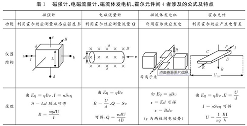 易錯點2:磁強計、印染污水流量計、磁流體發(fā)電機、霍爾元件間的區(qū)別與聯(lián)系磁強計、印染污水流量計、磁流體發(fā)電機、霍爾元件都是利用電磁場對帶電粒子的偏轉效應,并且穩(wěn)定時電場力與磁場力均達到平衡。很多學生容易將其混淆,遇到問題常常搞不清原理,亂代公式,筆者特將4者涉及的公式及特點等做一對比區(qū)別如表1所示。