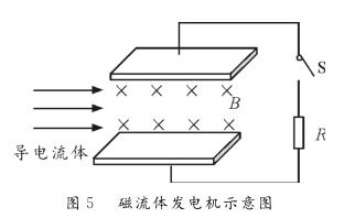 【例1】圖5為磁流體發(fā)電機示意圖。設兩金屬板間的距離為d,兩極板間勻強磁場的磁感應強度為B。等離子體垂直進入磁場的速度為v,單個離子所帶的電荷量為q。離子通道(即兩極板內所圍成的空間)的等效電阻為r,負載電阻為R。則下列判斷正確的是( )
