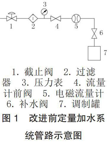 工廠的香料廚房系統(tǒng)為國內(nèi)煙機公司 2004 年設(shè)計制造,其定量加水系統(tǒng)主要由水源、管道電磁流量計、加水管路元件和控制程序這四部分組成,改進前管路示意圖如圖 1 所示。