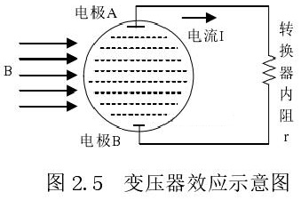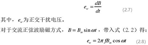 從上圖 2.5 中可以觀察到兩個電極、勵磁線圈、轉(zhuǎn)換器內(nèi)阻之間形成了一個閉合回路,將此回路稱之為初級繞組,從理論上進行分析,磁力線 B 應當平行于勵磁線圈所產(chǎn)生的磁感應線,但在實際的應用過程中由于工藝差異,因此無法達到理想狀態(tài),會產(chǎn)生磁力線穿過勵磁線圈磁感應線的情況,此時將會產(chǎn)生相應的感應電動勢,將此部分感應電動勢稱為變壓器效應。此效應同樣滿足于楞次定律,利用楞次定律進行計算可得如下電動勢: