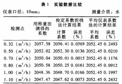 被檢儀表:公稱通徑分別為10mm和15mm的渦輪流量傳感器各一臺;檢定裝置:靜態稱重法標準水流量檢定裝置,系統精度+0.2%。分別采用常規的平均儀表系數法和檢定系數折線法進行標.定,并與作為標準的靜態稱重法的檢定結果進行比對,結果見表1.表2。