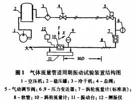 氣體流量管道周期振動試驗裝置結構如圖1。為避免氣體壓力波動,圖中設備1先將空氣壓縮打人2中,經3冷卻除濕后,得到的純凈氣體先后流經4、5、7、10后,通向大氣。流量校準采用渦輪標準表法,渦輪流量計內徑50mm,流量范圍5~100m3/h,精度為1%。兩臺壓力變送器的精度均為2‰。