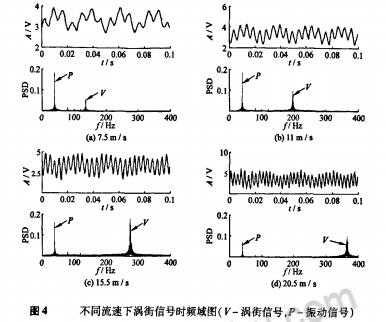 為了觀測管道周期振動下渦街流量信號的特征,利用NI USB-6009數據采集卡對渦街正弦信號進行采樣。以垂直方向管道振動加速度為0.1g為例,給出了不同流速下渦街信號的時頻域圖,如圖4所示。由時域部分可知,管道振動下渦街流量傳感器輸出的信號為真實旋渦脫落信號和管道振動信號的合成信號。低流速(≤1lm/s)時,管道振動信號強、占主要成分,渦街信號疊加在其上;隨著流速變大(11~20.5m/s),渦街信號逐漸顯露出來成為主要成分、淹沒振動信號。由頻域可知,振動信號成分較單一,呈尖峰狀,幅值為定值,不隨流速變化而變,除40Hz基頻外還有2、3倍頻出現;而渦街信號成分稍復雜,呈塔峰狀,幅值隨流速變大而迅速增強,頻譜能量占總能量比重也隨流速增加而變大。